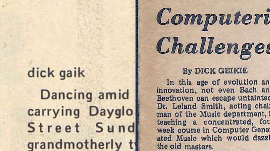 This discovery led to finding 6 bylines and additional staff box credits for Dick Geikie in the Stanford Daily student newspaper between June 25 and August 3, 1971. One of the bylines is the Chaparral computer music article re-printed in the Daily (or so I thought, more on that later this post).