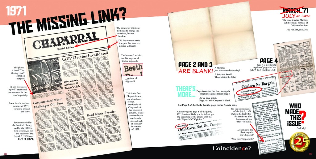 It is a certainty that the Chaparral issue in question is a fake, or prank, in that it is entirely composed of Stanford Daily articles from July 7, 9, and 23, 1971. The assumed “reprint” of the computer article was not a reprint at all–it was the original from the July 9, 1971 Stanford Daily. The fake issue is made to appear that it is Section 2 of the real March 5, 1971 Chaparral. The masthead contains the words “Special Edition” and has the date of March 5, 1971, but was actually created sometime after July 23, 1971, the date of the last lifted article from the Daily.