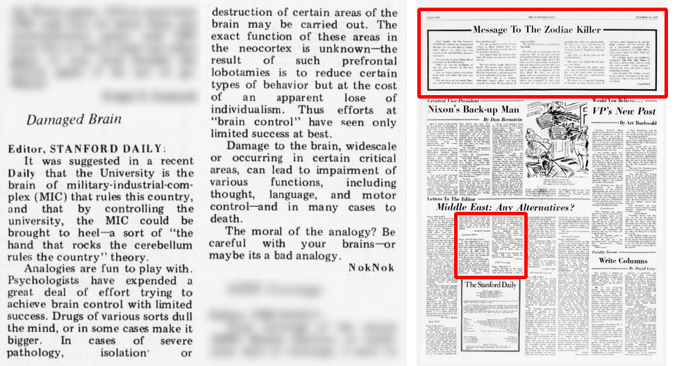 I would also like to include as a Mikado-Zodiac coincidence the October 24, 1969 Stanford Daily, with a student-written Message To The Zodiac Killer editorial on the same page with a letter to the editor authored by N okNok. This editorial ran the same day (10/24/69) as the Berkeley Tribe’s “A Message For The Zodiac Killer” written by Blaine, the primary accuser of Richard. Blaine said he wrote his editorial at the request of Richard.