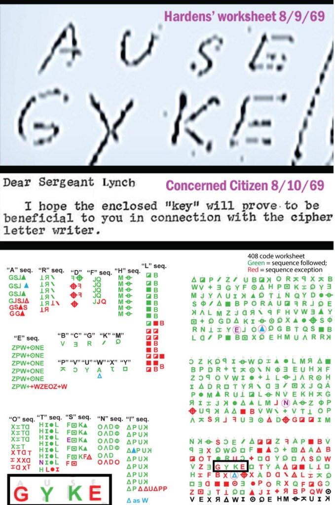 In that context, I would just like to ask why the Concerned Citizen put quotes around the word “key” in his August 10, 1969 letter that contained a correct solution to the 408 code? I conjecture that it is because “key” is special. “Key” isn’t really the key to the cipher, it is the “key”. In my opinion as a prankster and wordsmith, I agree with those who posit that GYKE solves to AUSE when you have the “key.” This opinion has been around online for years, I only note that if Richard Gaikowski is indeed confirmed to be the perpetrator, this is certainly what is meant by “In this cipher is my identity,” in the letter to the Chronicle accompanying part 3 of the code.