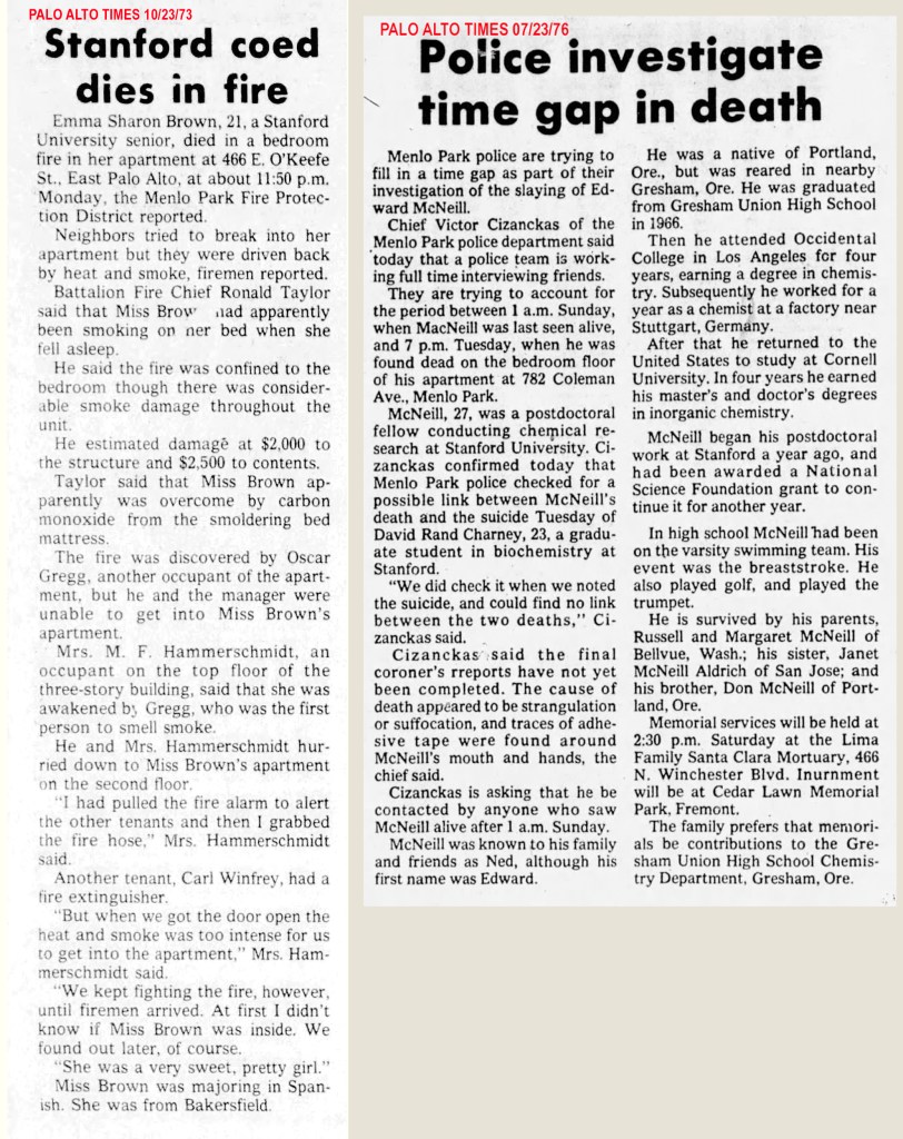 Between 1 am and 4 am on the morning of July 17, 1976, Edward Alan McNeill, age 27, was found dead in his apartment in Menlo Park. He was a postdoctoral researcher in chemistry at Stanford. There were traces of adhesive around his mouth and the death was ruled a strangulation. There were no signs of struggle.
